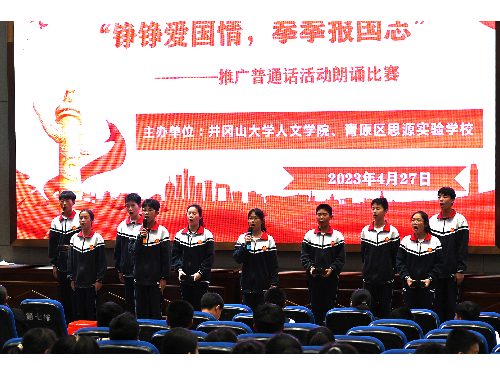 为激发中学生的爱国情怀,推广普通话,提高学生普通话水平,推进我校师范类实习生在中学实习的传帮带作用,4月27日,人文学院与青原区思源实验学校联合举办主题为“铮铮爱国情,拳拳报国志”的诗歌朗诵比赛,比赛面向思源实验学校七年级学生,实习带教老师黄梅、汉语言文学专业师范类实习生和思源学校领导、师生共300余人出席。