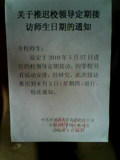 2.“关于推迟校领导定期接访师生日期的通知”落款日期“2010年5月26日”