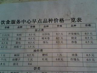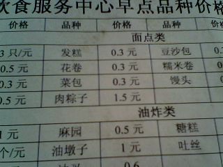 1.“饮食服务中心早点品种价格一览表”之“麻园”(圆)“开发馒头”(花)